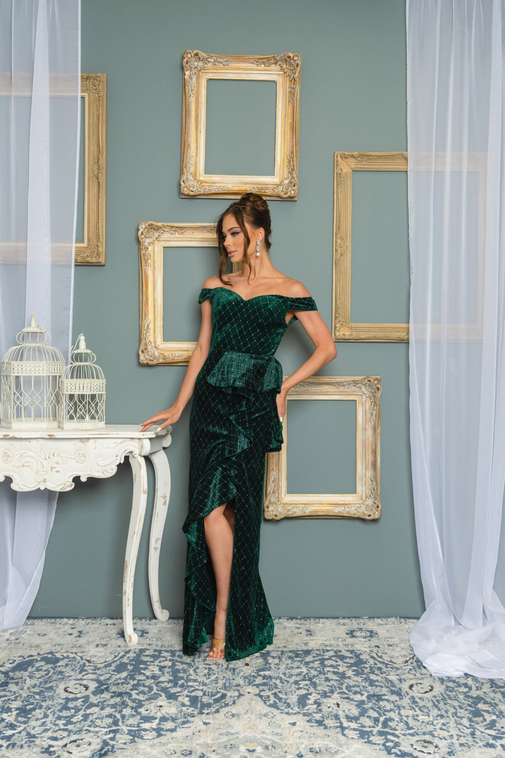 Maxi dress with glitter detail and peplum ruffle on side hip, slit open side.